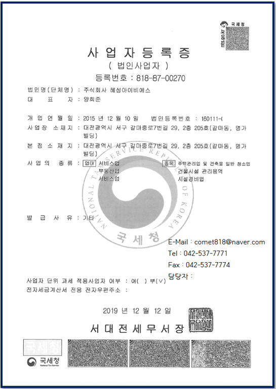 홈 > 혜성IBS소개 > 회사등록사항