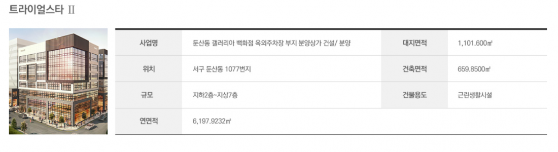 트라이얼스타 B동 최고관리자 빌딩상가 0 1634 2020.04.28 14:57 소재지 : 대전 서구 둔지로 11건물규모 : 지하2층~지상7층 / 연면적 6,197㎡(약 1,874평)
