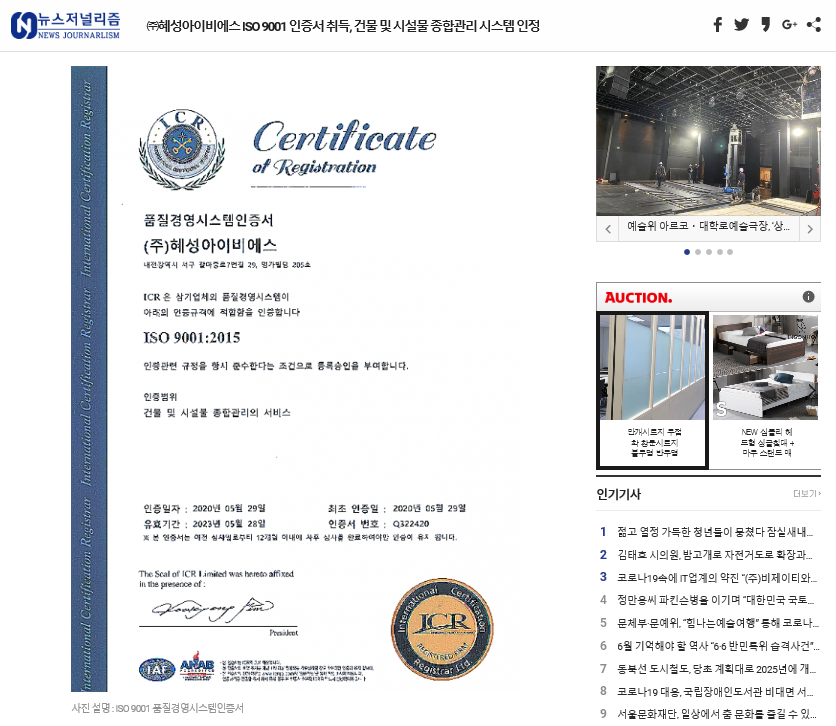 (주)혜성아이비에스 ISO 9001 인증서 획득